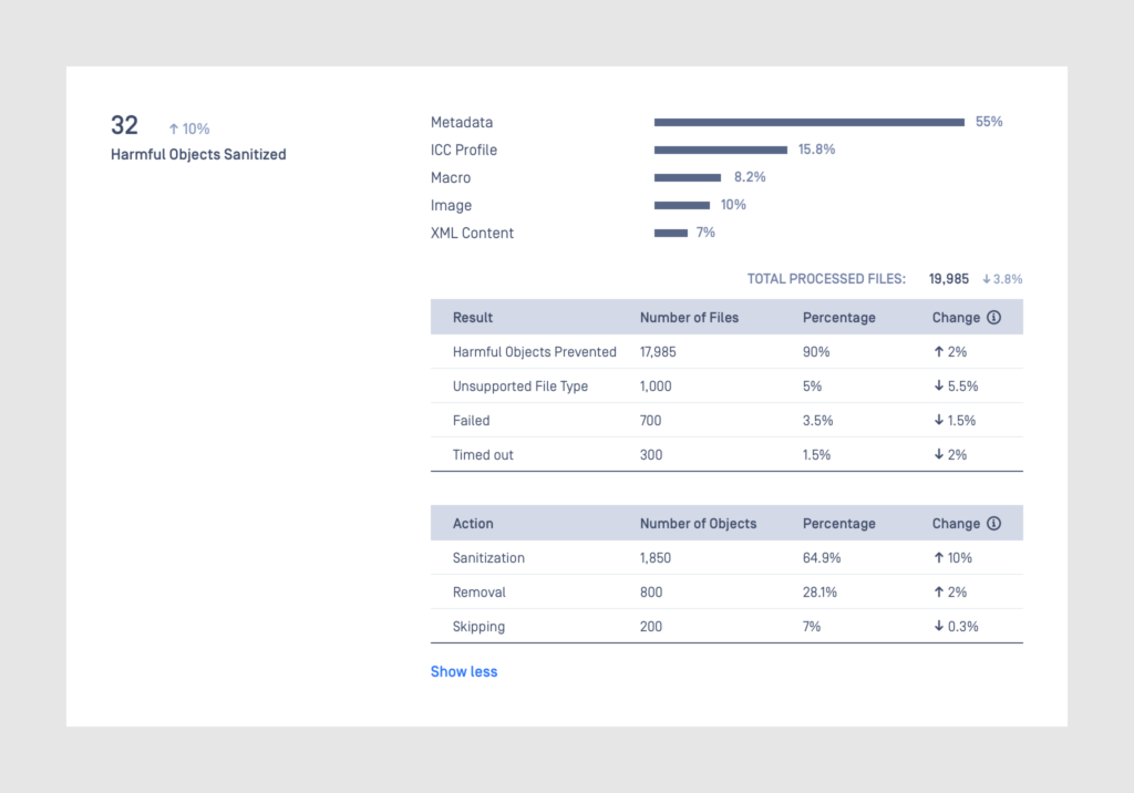 • Deep Content Disarm & Reconstruction: Recursively sanitizes files and their embedded objects to remove potential threats.