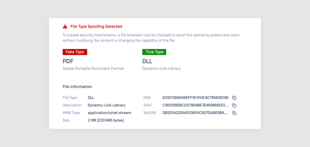To bypass security mechanisms, a file’s extension can be changed to spoof the operating system and users without modifying the content or changing the capability of the file. File Type Verification identifies a file based on its actual content, not the unreliable extension.