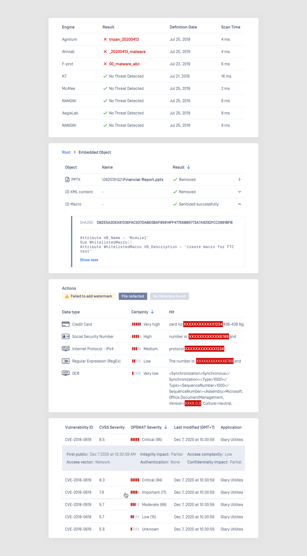MetaDefender Core allows you to detect, analyze and eliminate malwares and Zero-day attacks with the combination of 4 main cutting-edge threat prevention and detection technologies: